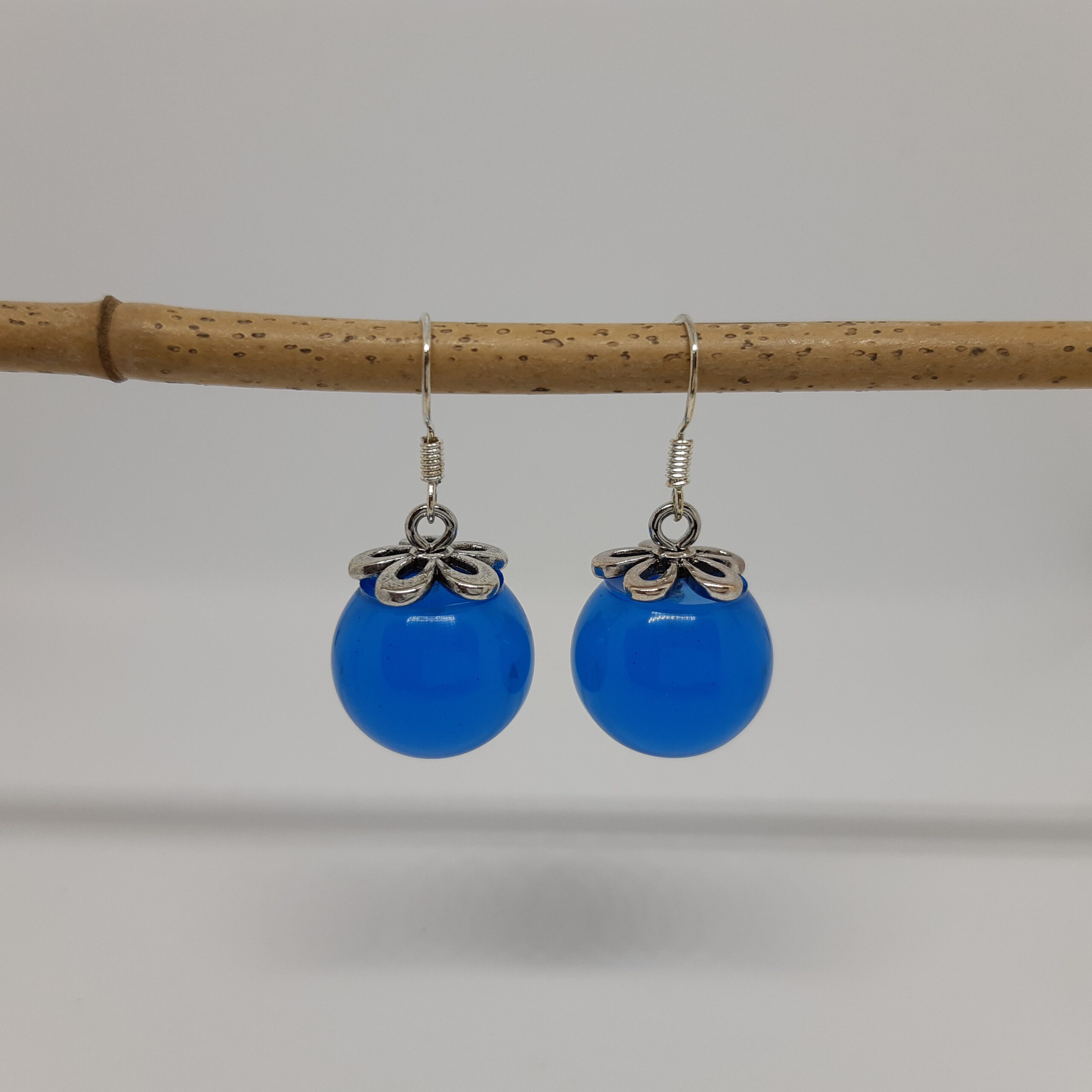 Mit den handgefertigten, glasähnlichen Perlen der Ohrringe „Transparent Blue“ haben einen Durchmesser von circa 16 mm. Auf dem Kopf glänzt jeweils eine silberne Blumen-Perlenkappe. Die filigranen, silbernen Fischerhaken lassen die Ohrringe frei baumeln. und im Sonnenlicht strahlen. Damit sie nicht verloren gehen, halten die Silikon-Stopper deine Ohrringe fest am Ohr.